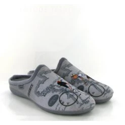 Mules en textile gris motifs heure de la bière/ apéro.