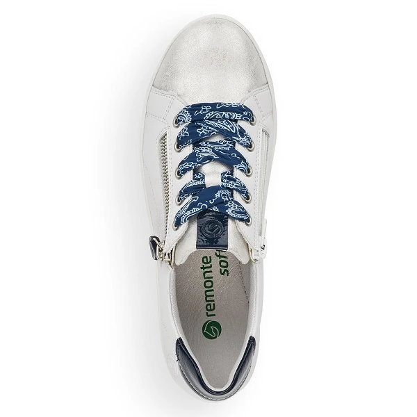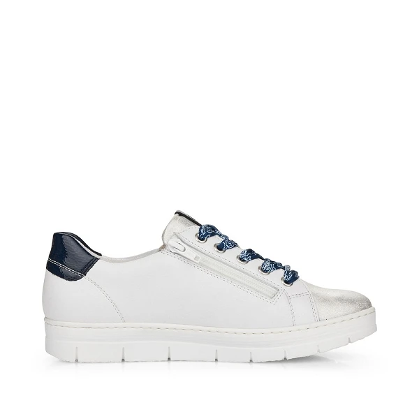Remonte D5825 80 est une tennis femme en cuir enduit blanc et détails bleu marine.